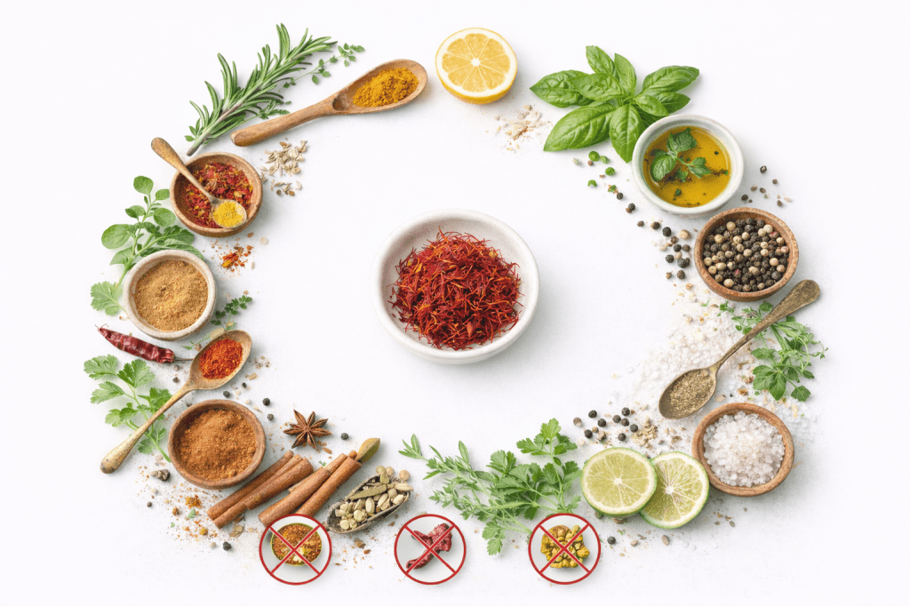 3–4 szál sáfrány mellé általában egy csipet elegendő a kísérő fűszerből.